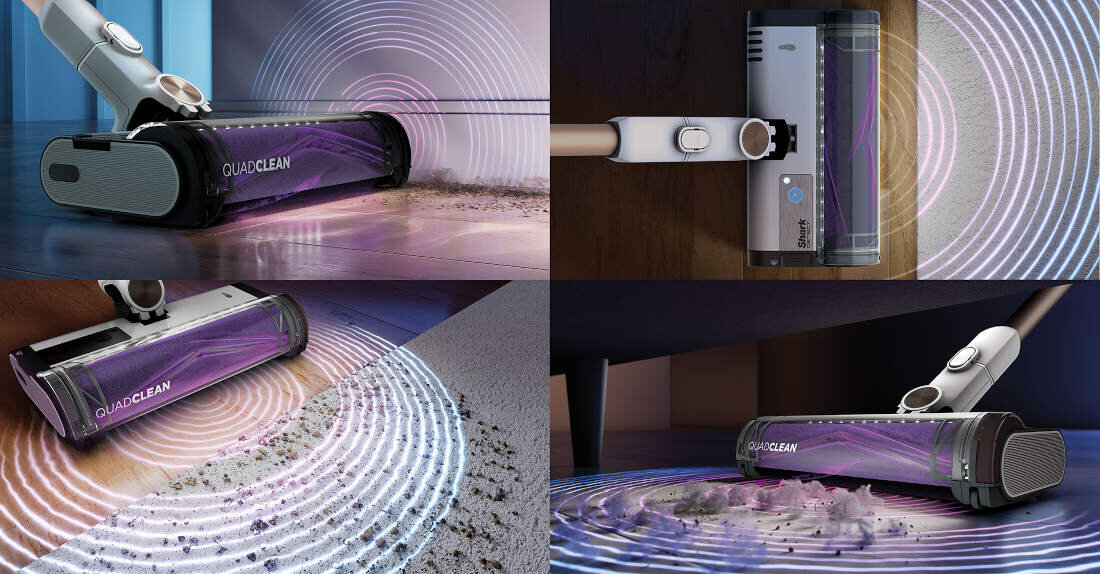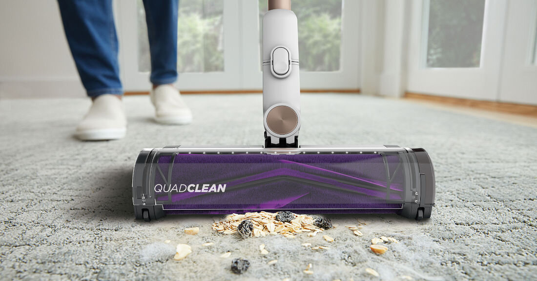Dokładnie czyść zarówno dywany, jak i twarde podłogi dzięki rolce szczotki QuadClean, która skutecznie radzi sobie z różnymi rodzajami powierzchni bez potrzeby jej wymiany. Ta innowacyjna szczotka ma specjalną konstrukcję, która obejmuje: