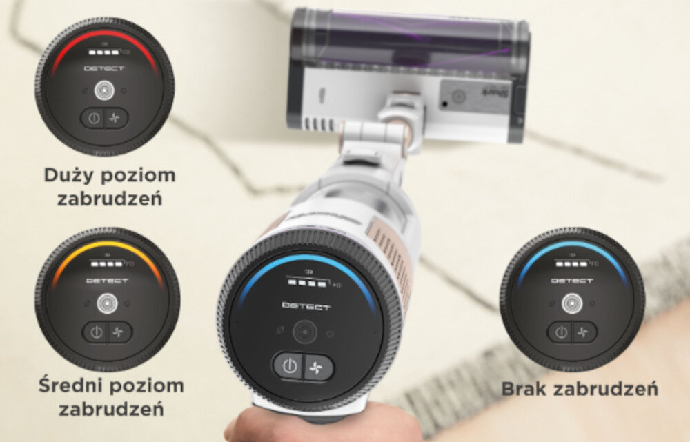 Wyświetlacz LED dostarcza przydatnych informacji podczas sprzątania, pokazując stan baterii, poziom zanieczyszczenia powierzchni oraz aktualnie wybrany tryb czyszczenia. Dzięki tym danym możesz na bieżąco monitorować wydajność odkurzacza, co pozwala na planowanie sprzątania.